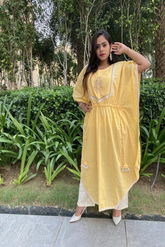 Yellow Cotton Hand Work Kaftan Set