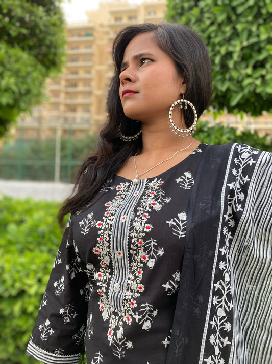Black Embroidered Pure Cotton (Set of 3) Suit Set