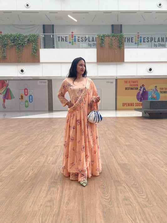 Peach Long Anarkali Mirror work Suit Set