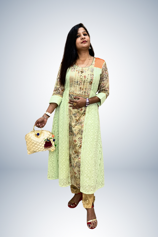 Cream Green Printed Anarkali Dress