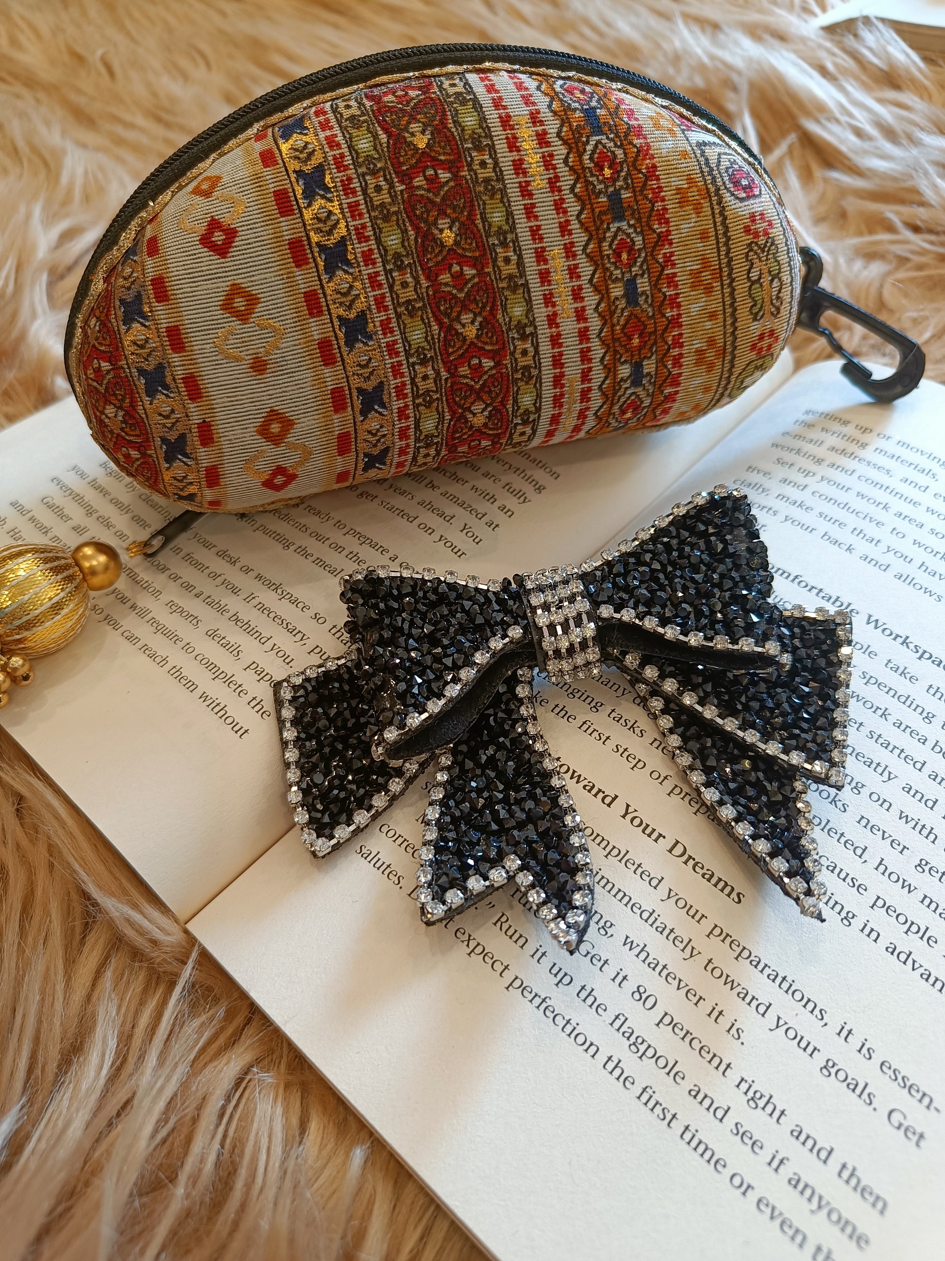 Description -Its a combo of a Sunglass cover & Detachable bow or Brooch ( Black color Bow with pin backside ) .DM us or whatsapp on 9811330602 for any kind of query .