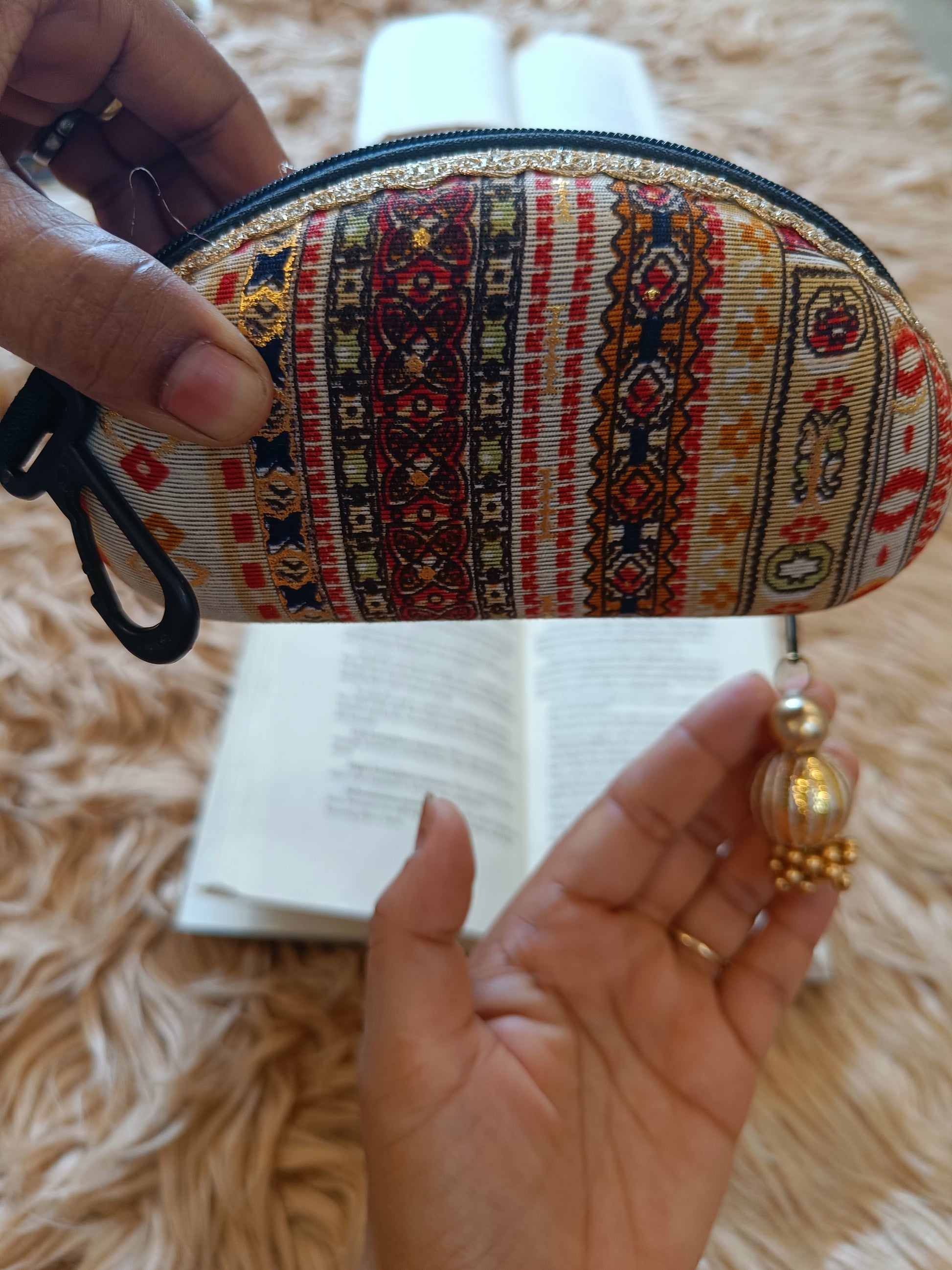 Description- This is sunglass cover with Zipper & a little Gota Detailing on one side & another side is a hook for hanging it to your handbag .